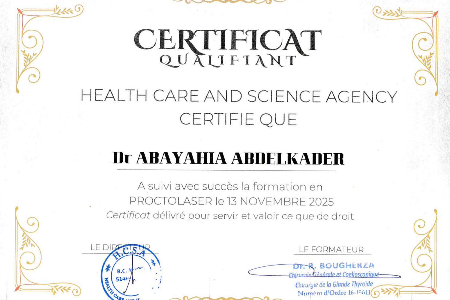 Le Dr Abayahia Abdelkader vous accueille pour des consultations spécialisées avec échographie au cabinet, et réalise les interventions chirurgicales dans des cliniques hautement équipées pour garantir sécurité, qualité et confort.